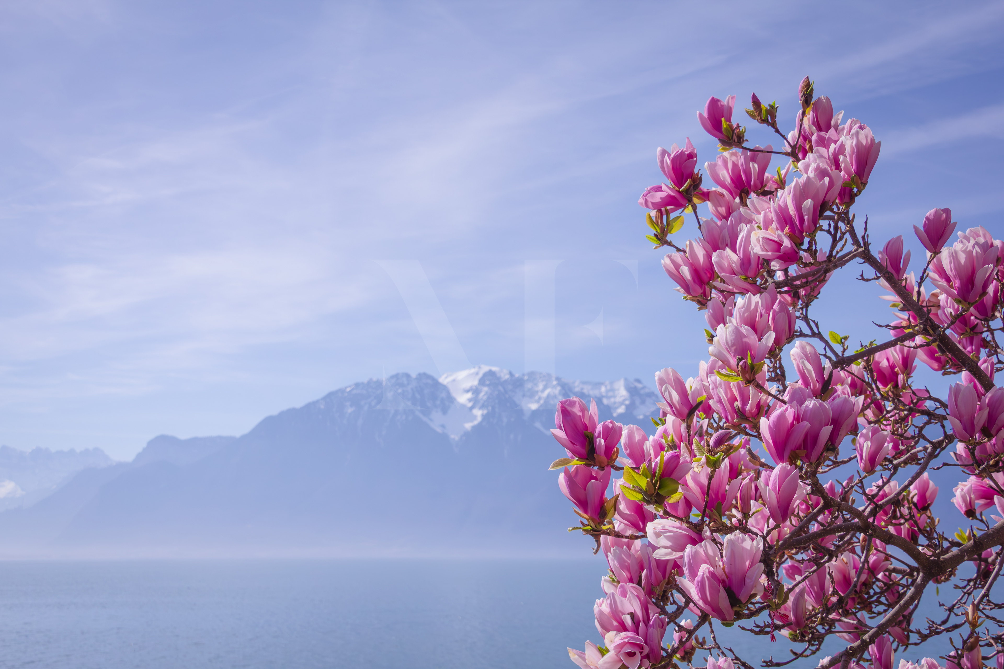 Blooming magnolias rise against a breathtaking landscape, where lake and mountains fade into a soft haze.