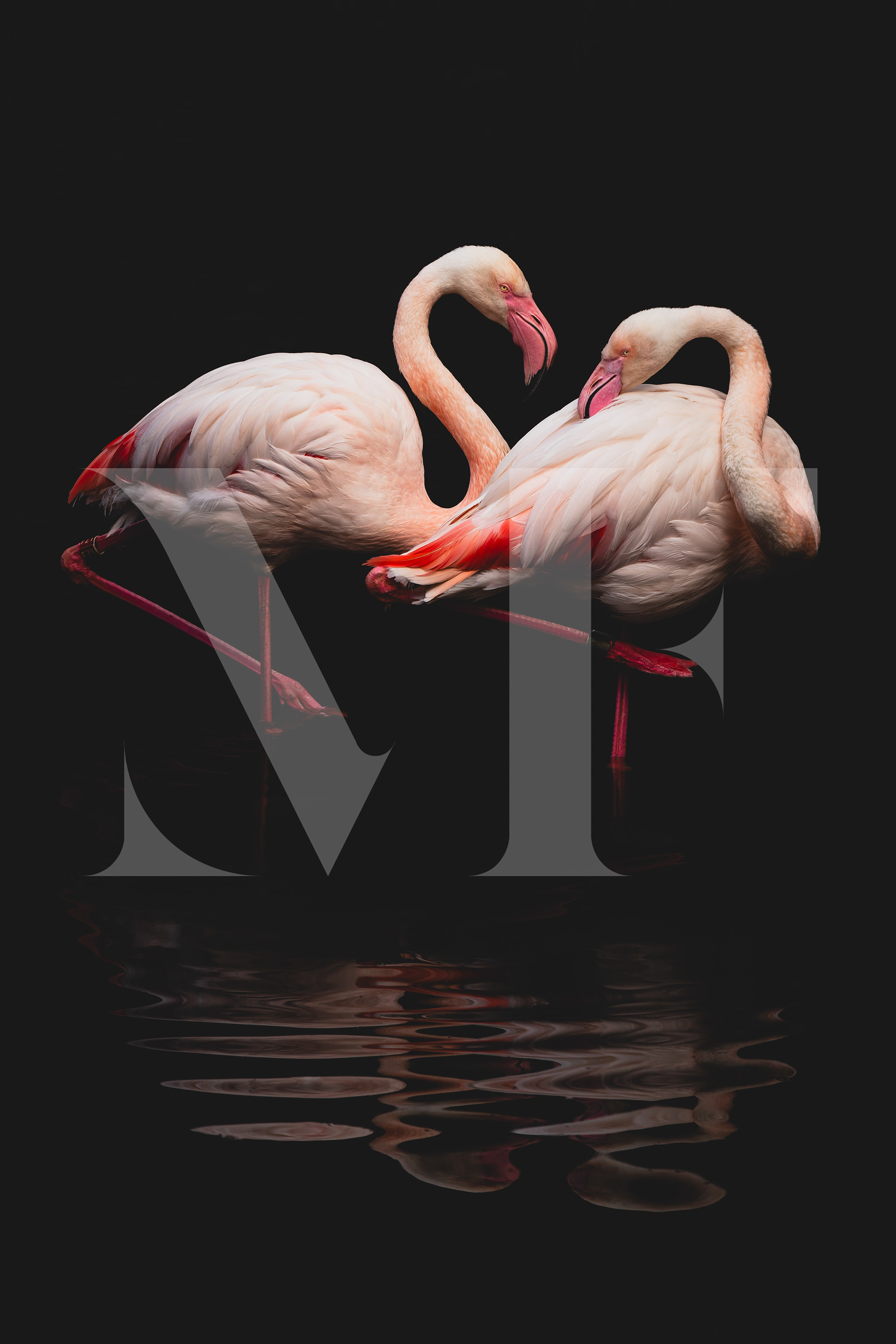 Two flamingos, frozen in the quiet darkness, embody grace and the pure poetry of natural form.