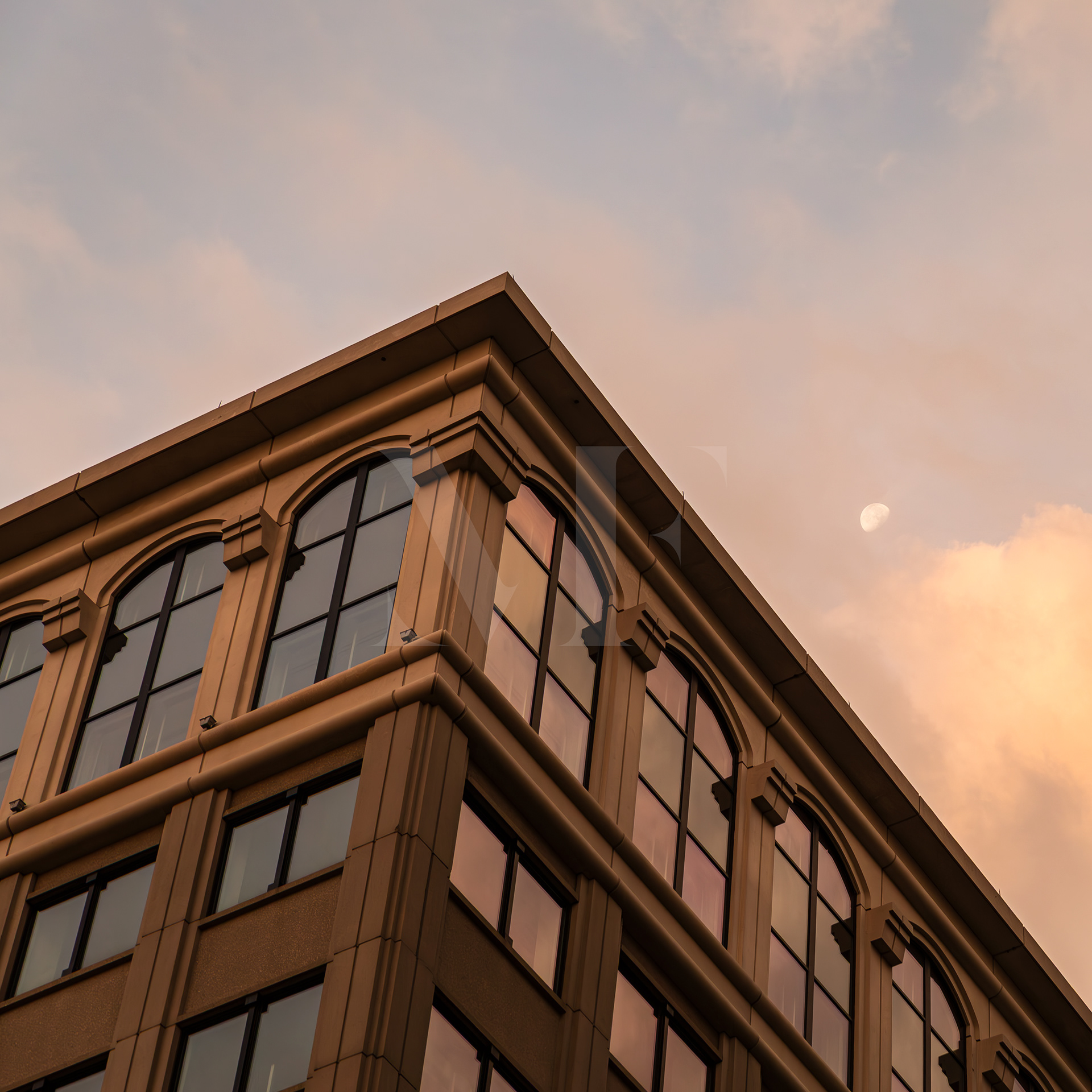 Bathed in warm evening light, the building’s geometric lines rise into a soft sky
