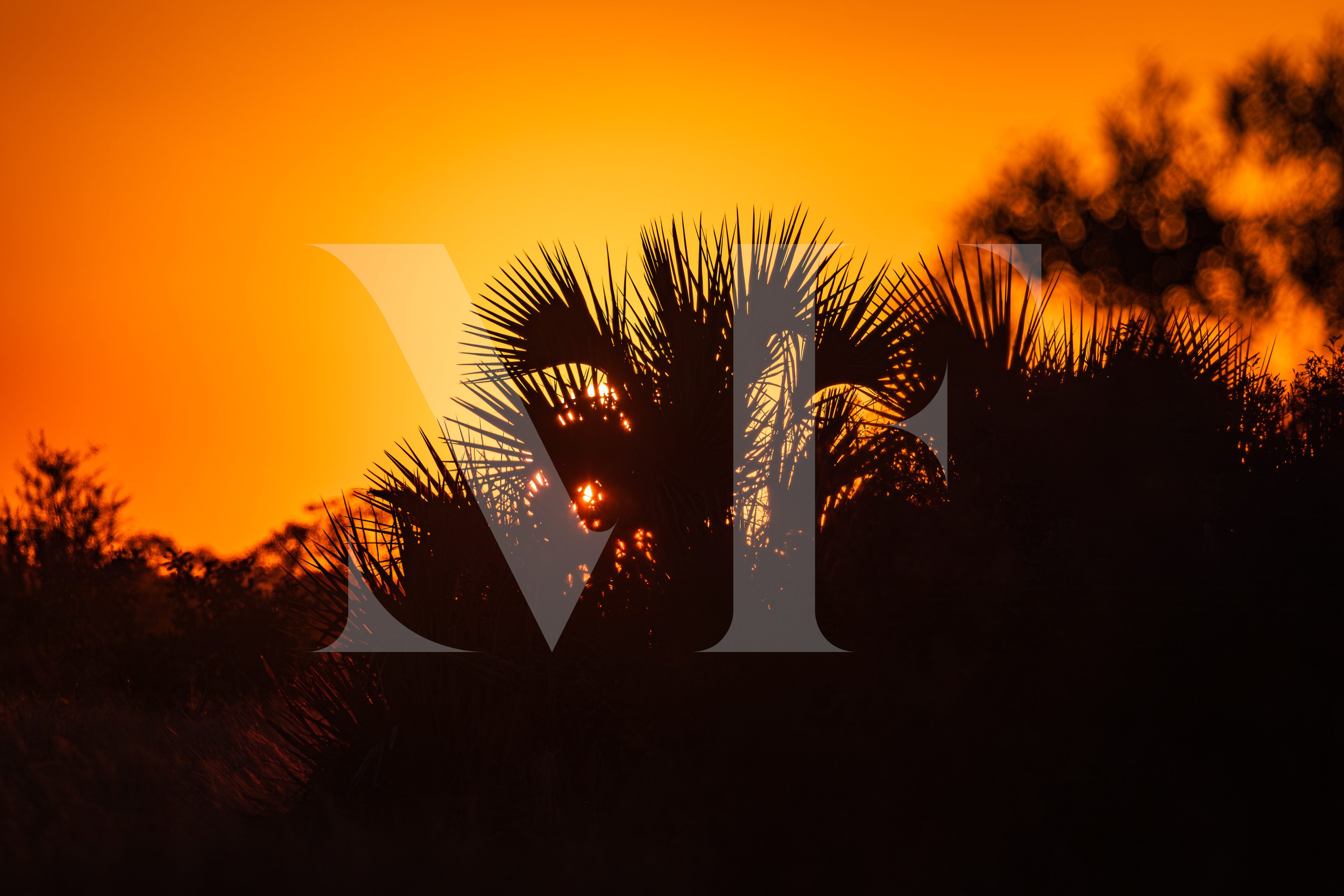Les contours du végétal se découpent en une dentelle d’ombres et de feu, révélant la structure intime du crépuscule africain.
