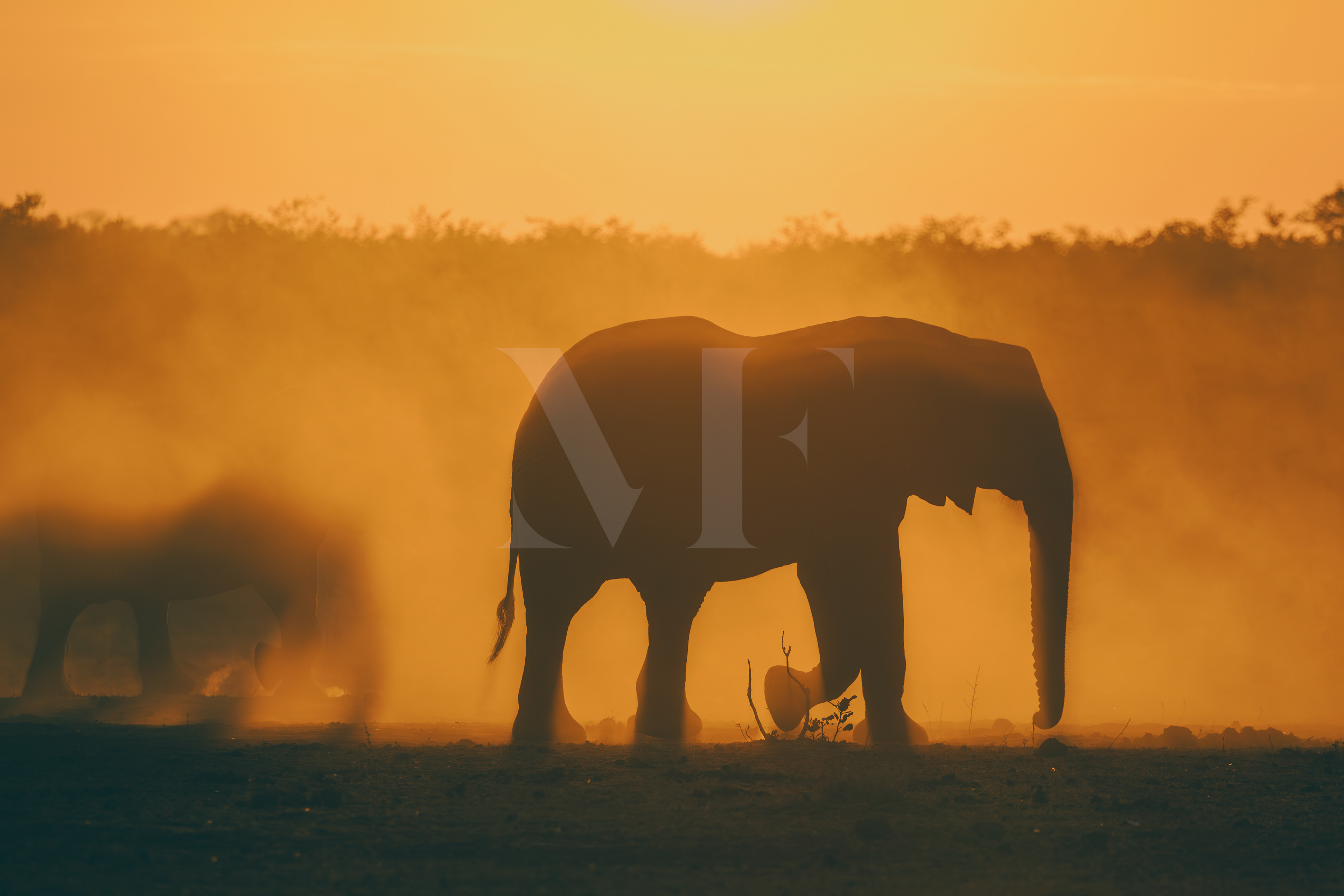 Wrapped in golden dust, the elephant moves slowly through the fading light.