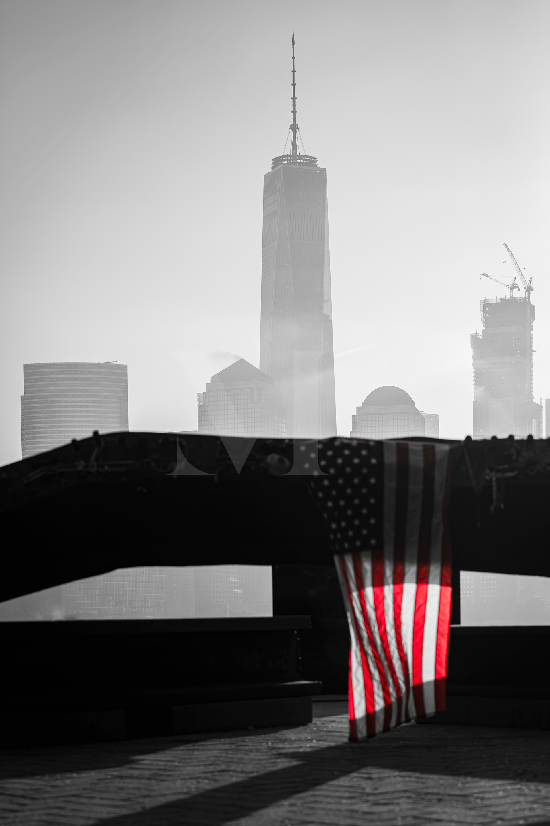 In the haze of a quiet city, a tower rises as a symbol of resilience.