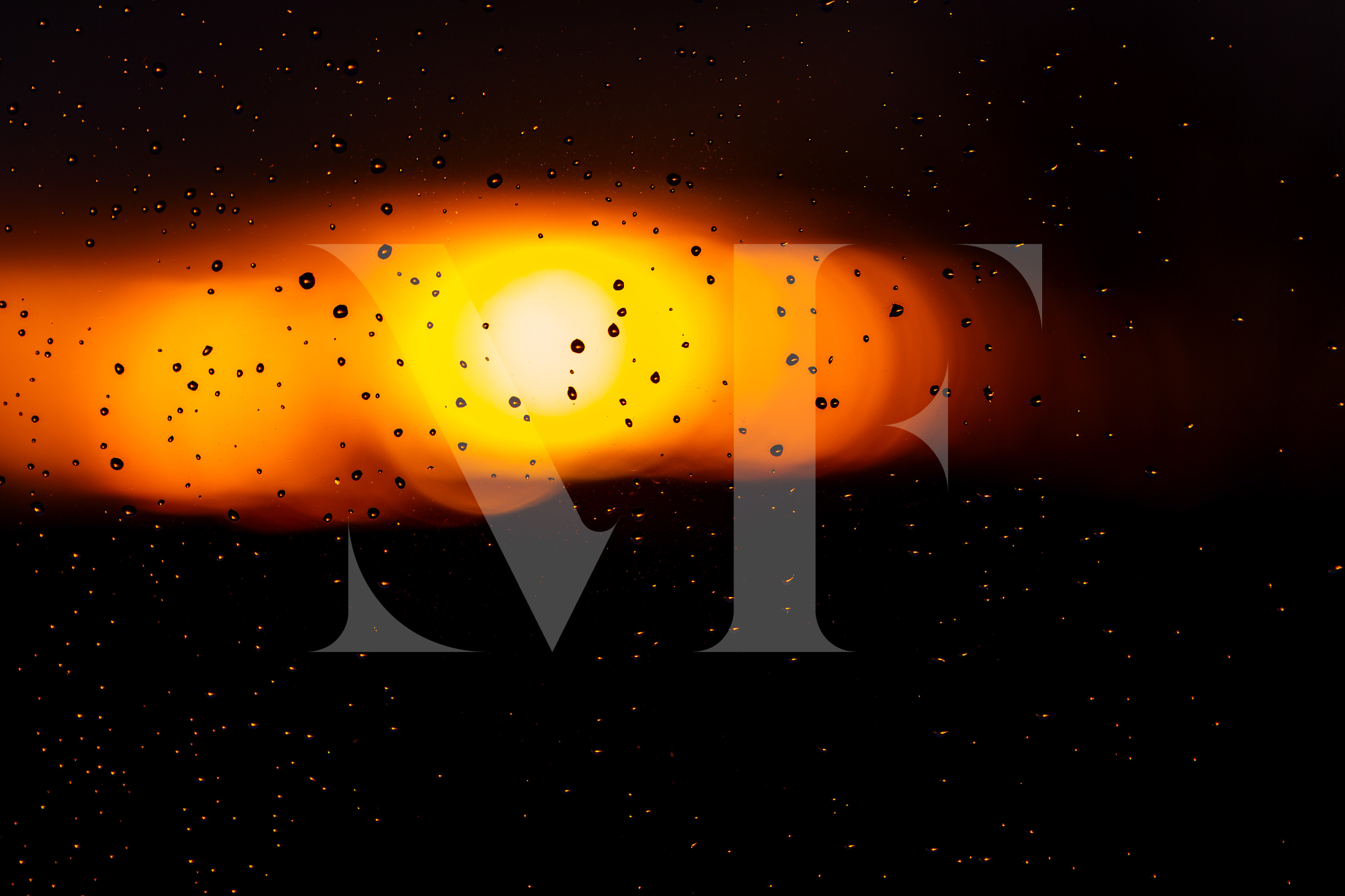 Comme un soleil en suspension derrière une constellation de gouttes, la lumière semble naître dans l’obscurité.