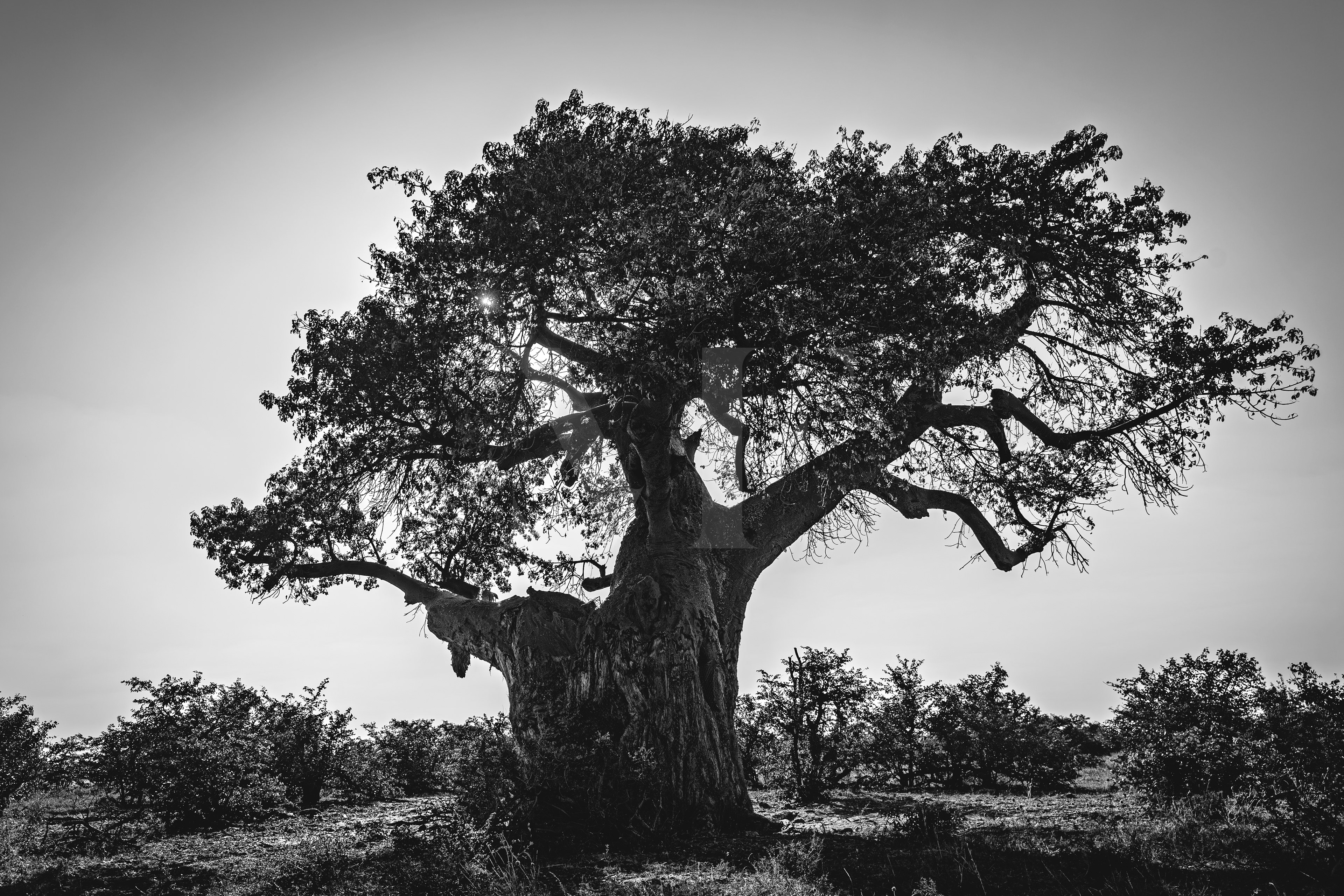 Sous un ciel lumineux, un arbre ancien déploie ses branches comme une cathédrale naturelle.
