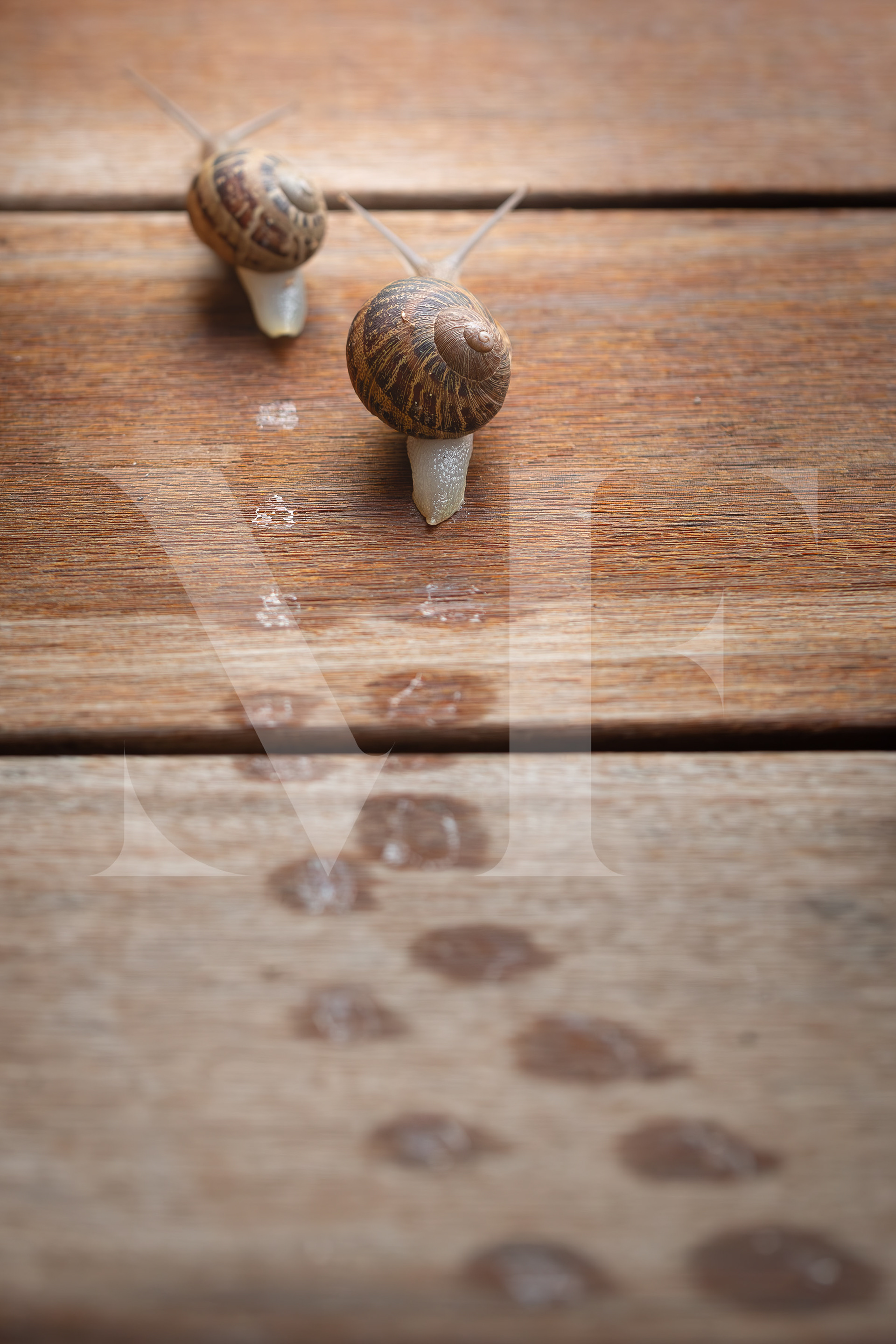 On the damp wooden surface, two snails move forward at their own unhurried pace,