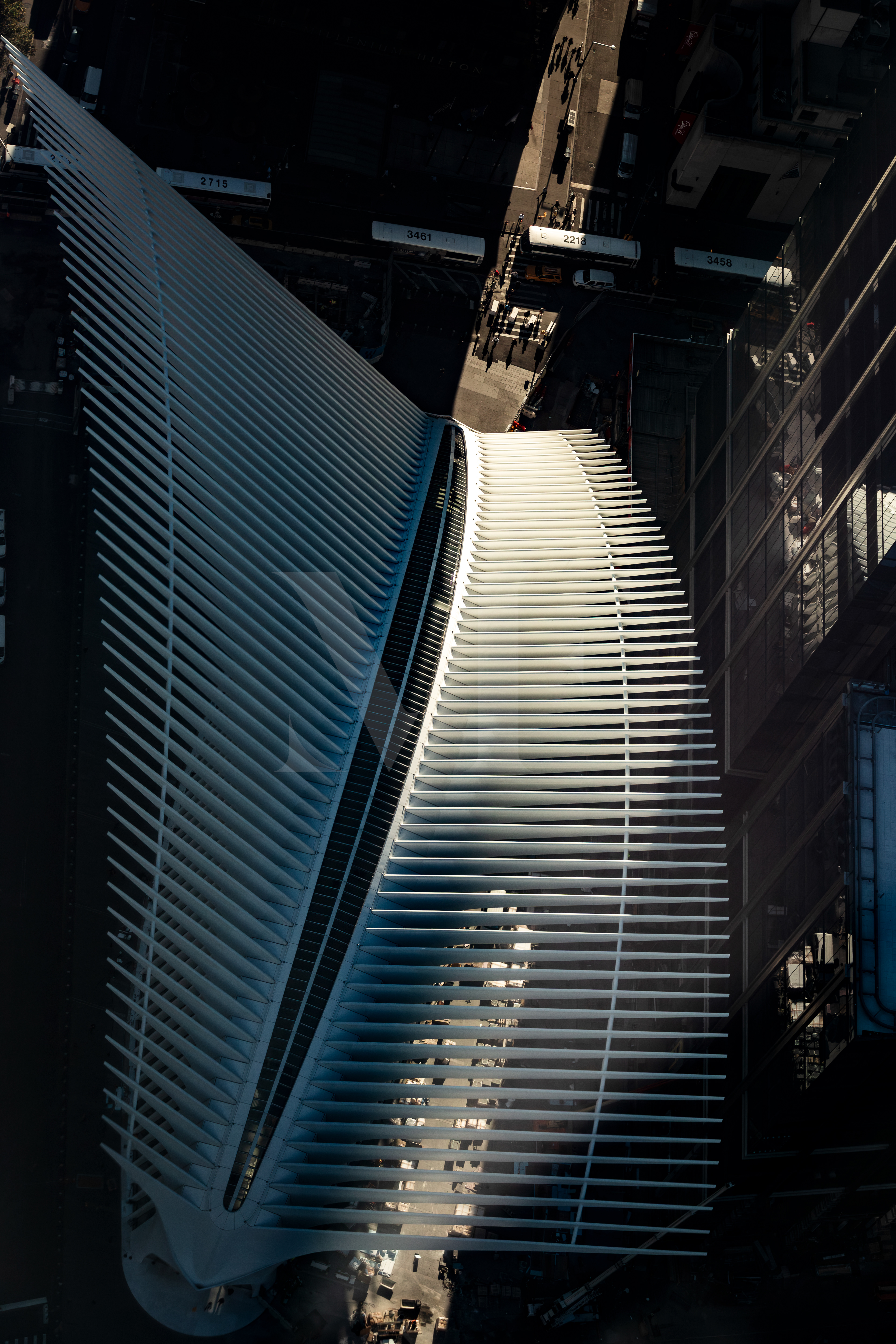 The white structure cuts through the city’s shadow like a seam of light in the urban fabric.