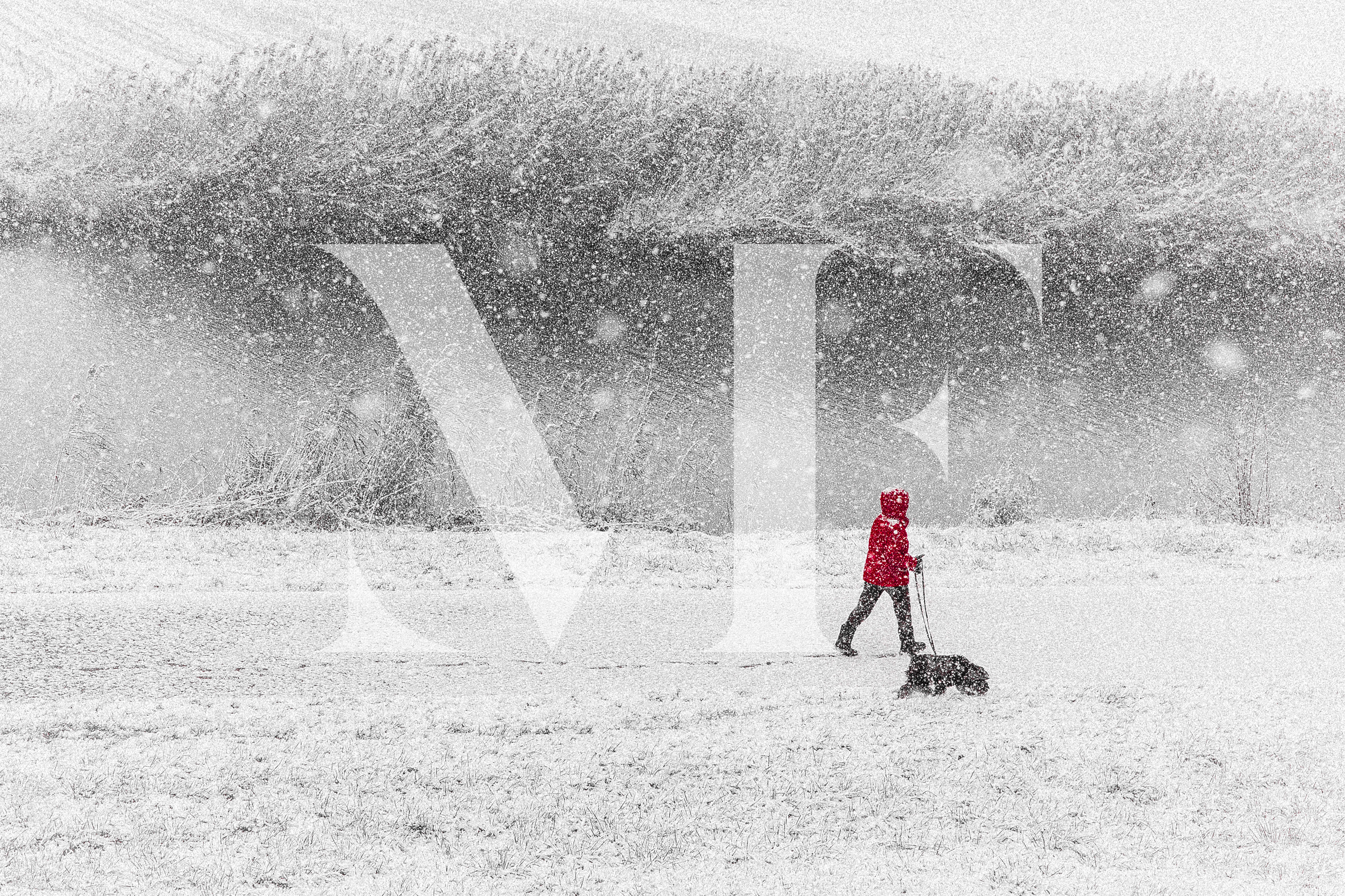 Under the heavy snowfall that blurs all landmarks, a red silhouette moves forward, sheltered from the cold, followed by a quiet companion.
