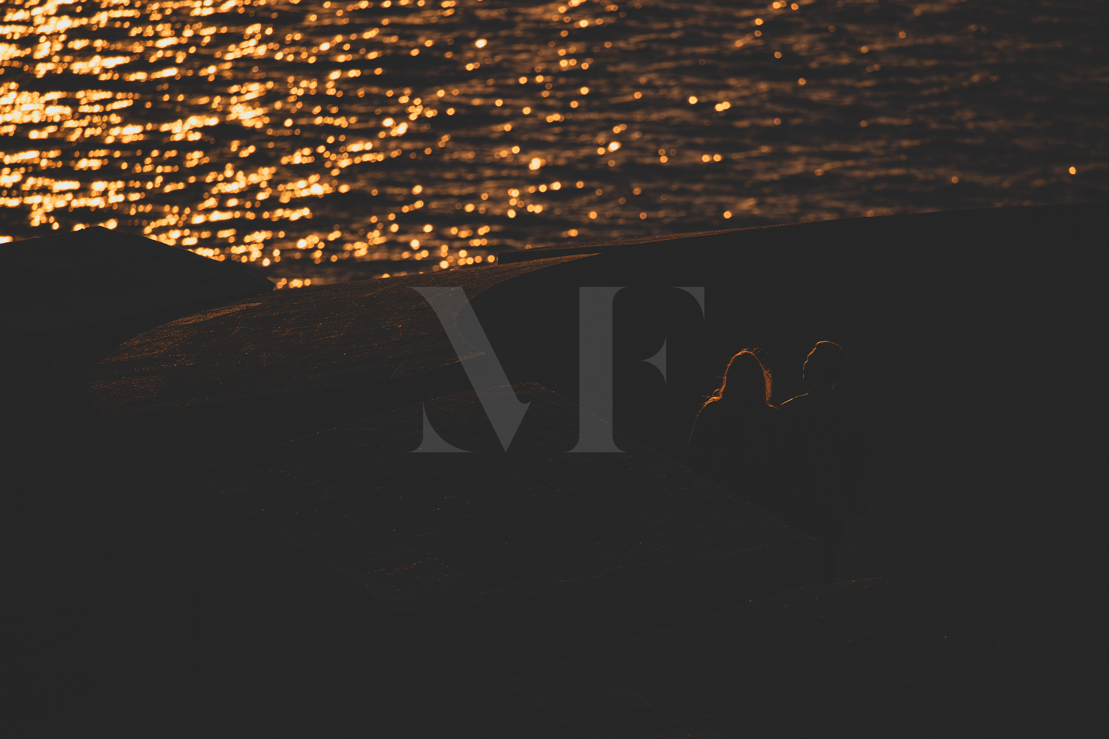Two still silhouettes emerge from the shadows, facing a sea ignited by the evening light.